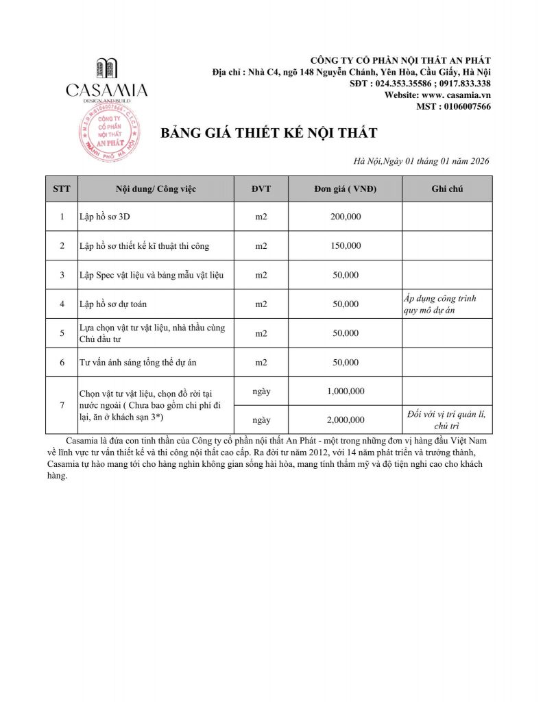 Chúng tôi hiểu rằng mỗi công trình là một câu chuyện riêng biệt – phản ánh cá tính, gu thẩm mỹ và phong cách sống của từng gia chủ. Chính vì vậy, Bảng báo giá thiết kế nội thất 2026 không đơn thuần là một con số, mà là cam kết về chất lượng dịch vụ, tính minh bạch và giá trị bền vững mà Casamia mang lại cho khách hàng.