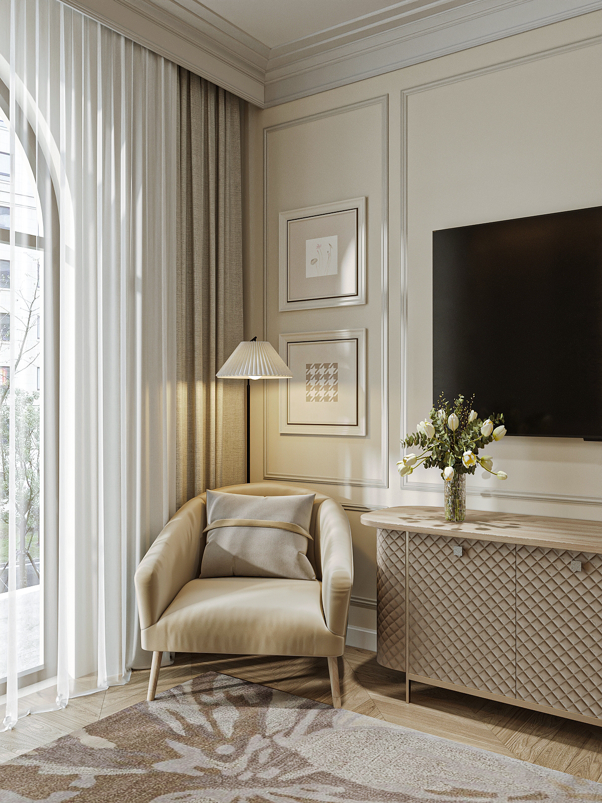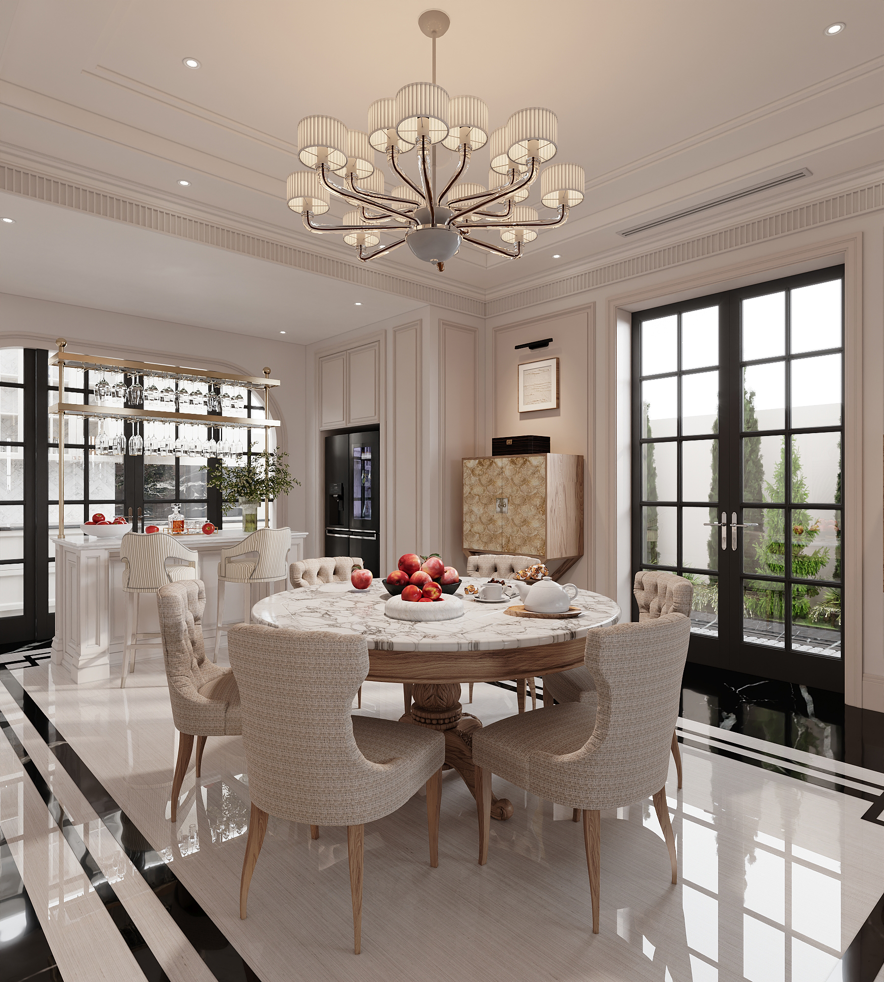 Phòng khách phong cách Neo Classic mở ra đầu tiên với tông màu trắng – kem chủ đạo, điểm xuyết sắc nâu gỗ tự nhiên. Bộ sofa bọc mềm mại kết hợp với lò sưởi đặt ở trung tâm không gian, khiến phòng khách trở thành điểm tụ họp đầy ấm áp của gia đình trong những buổi chiều lộng gió hay tối se lạnh. Những mảng tường trang trí và kệ sách mở mang đến nét dung dị, trong khi các khung cửa kính lớn cho phép ánh sáng ngập tràn căn phòng, gắn kết thiên nhiên bên ngoài với nhịp sống bên trong.