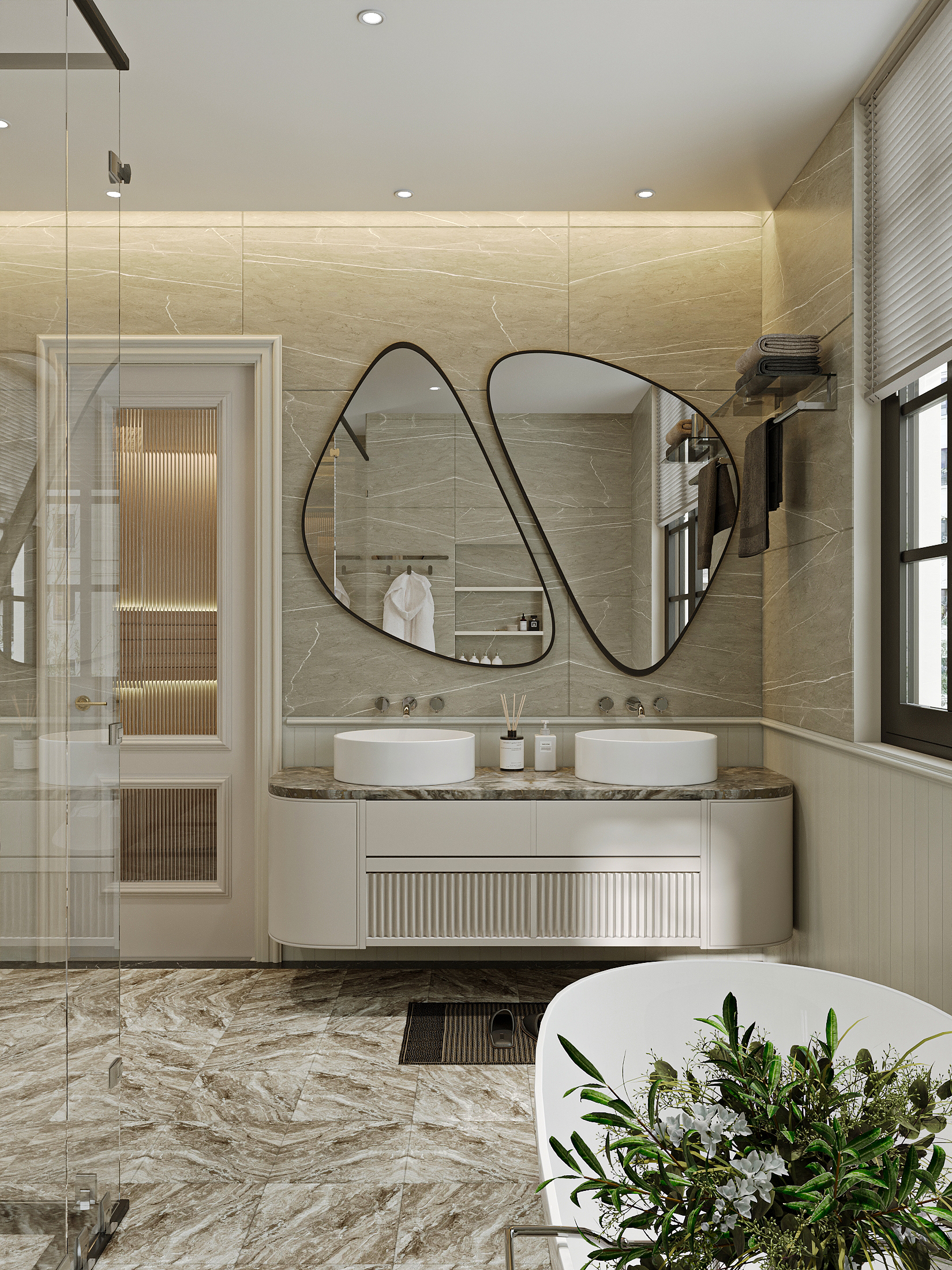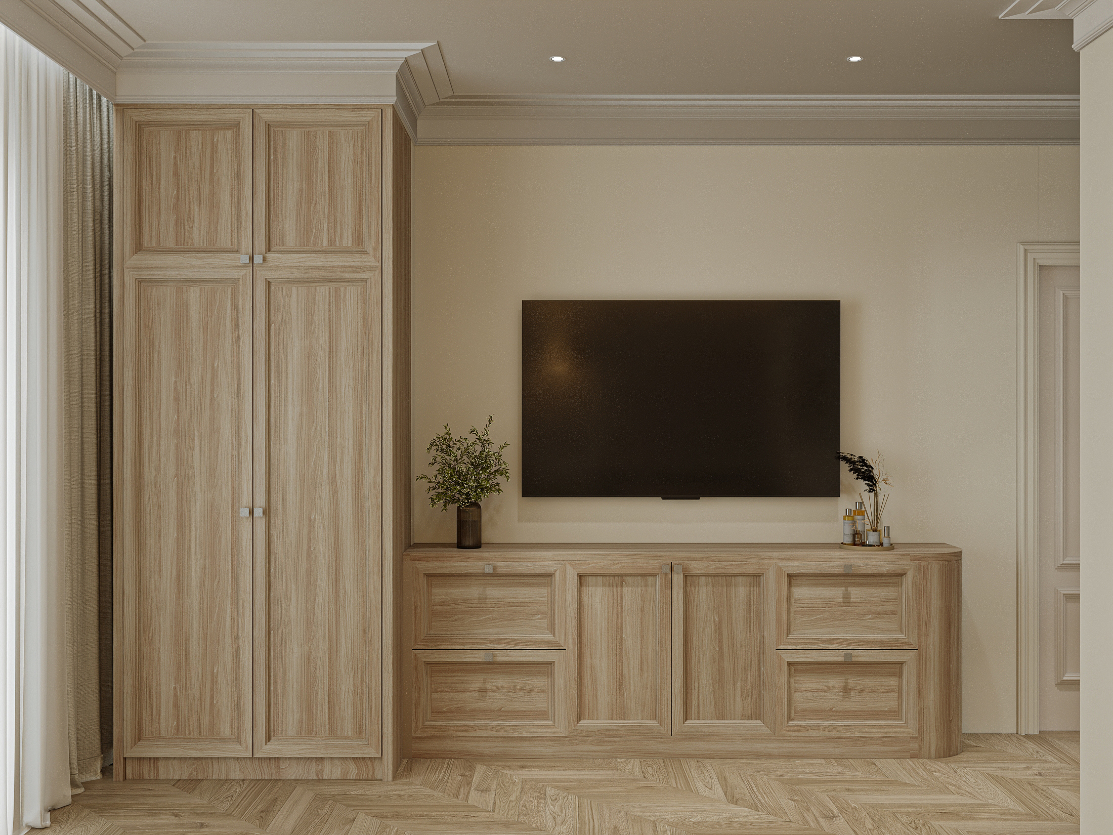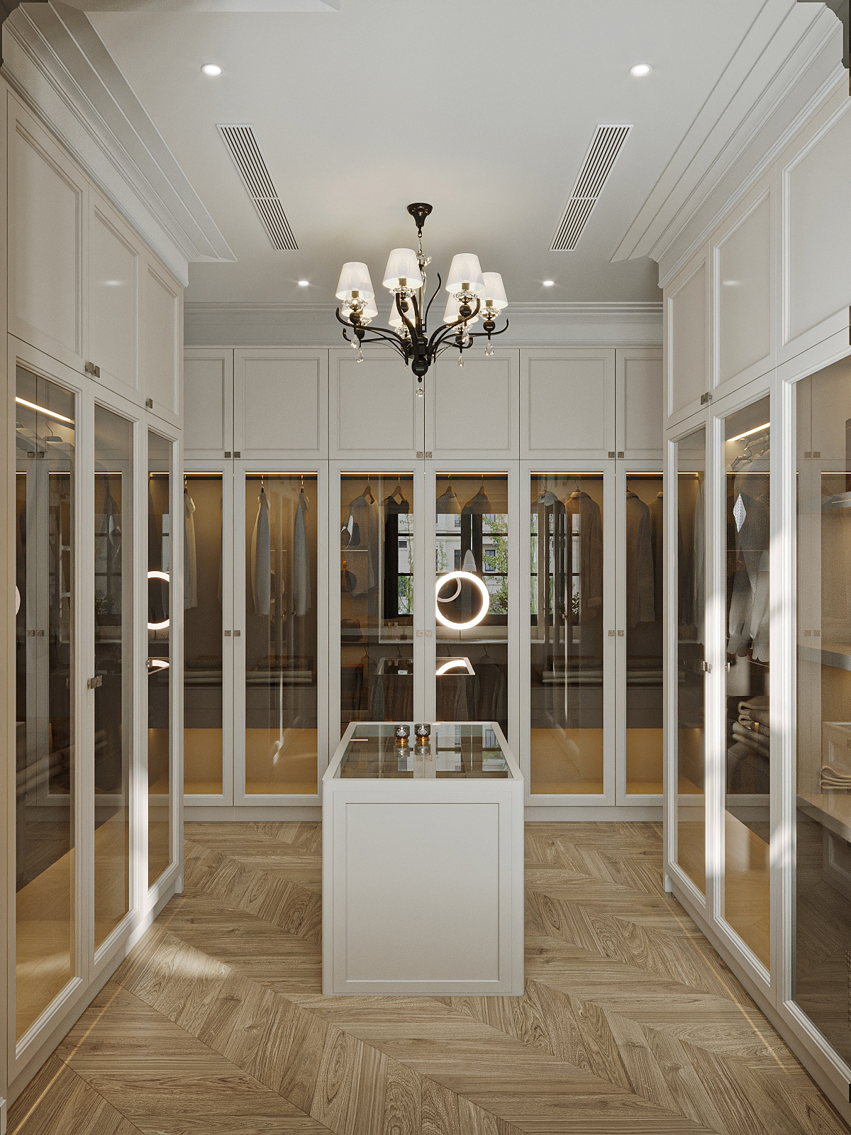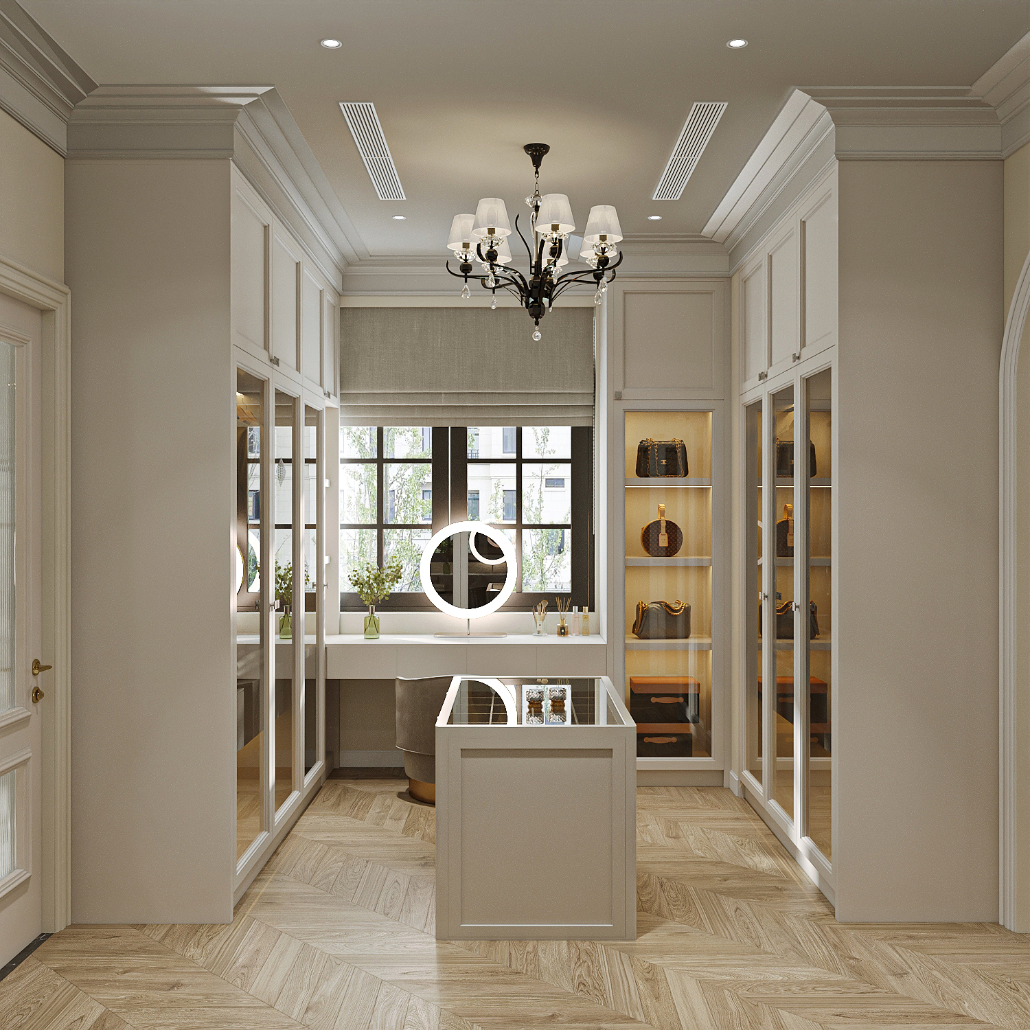 Một không gian mang đậm hơi thở châu Âu, được bố trí như một boutique thời trang riêng tư. Hệ tủ kính cao kịch trần, cánh trong suốt kết hợp ánh sáng vàng dịu tôn lên vẻ đẹp của từng món đồ. Ở giữa là bàn trưng bày với mặt kính sang trọng, dành riêng cho những phụ kiện tinh xảo. Góc bàn trang điểm cạnh cửa sổ vừa nhận đủ ánh sáng, vừa tạo sự riêng tư tinh tế.