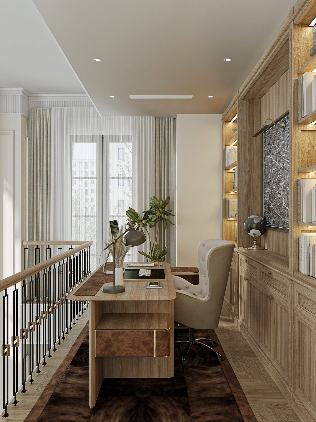Không gian làm việc được thiết kế tối giản nhưng sang trọng, với hệ tủ sách âm tường bằng gỗ sáng màu, nổi bật nhờ ánh sáng hắt nhẹ tinh tế. Chiếc bàn làm việc đặt chính giữa, đối diện khung cửa lớn tràn ngập ánh sáng tự nhiên, tạo cảm giác rộng mở và tràn đầy năng lượng. Điểm nhấn là bức tranh bản đồ mang sắc thái cổ điển.